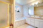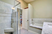 wnętrze łazienkę z przeszkloną kabiną prysznicową drzwi