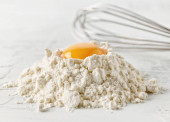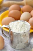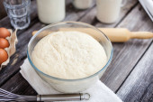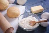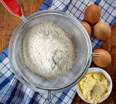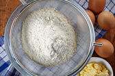 misa i mąka w sito na stole kuchennym do wyrobu ciasta