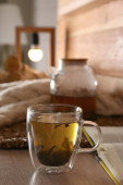 Czajnik i filiżanki gorącego napoju na stole w pokoju