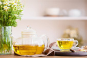 Czajnik i szklanki z gorącym napojem na tacy w pokoju