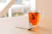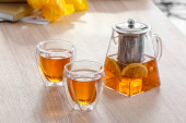 Czajnik i filiżanki gorącego napoju na stole w pokoju