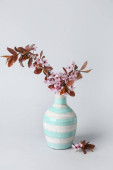 Wazon z piękną kwitnącą gałęzią na stole na jasnym tle