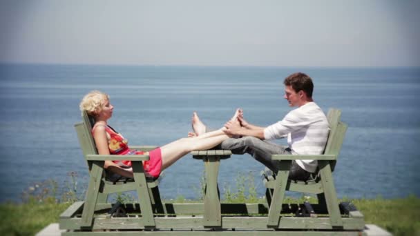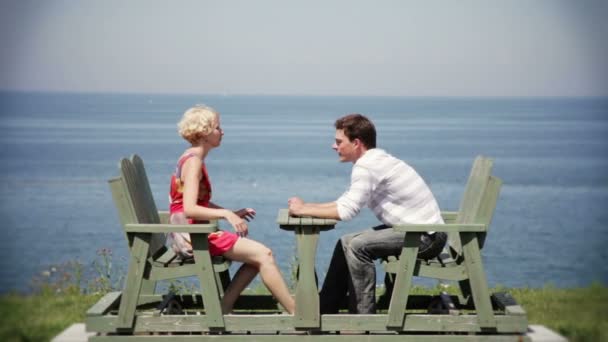 Młody mężczyzna klęczący przed dziewczyną śmiejący się razem w domku na plaży, Aero