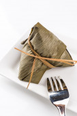 Ela Ada lub gotowane na parze słodkie pierogi ryżowe, gotowane na parze ciasta ryżowe zawinięte w liść banana, Kerala tradycyjne przekąski pozycji, ułożone w białą ceramiczną płytę