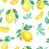 Płynny wzór z cytryn i liści izolowanych na białym tle. Letnia ilustracja akwarela. Tekstura tkanin, papier pakowy, odzież, ubrania, opakowanie.