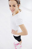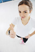 koncepcja szczęśliwy dieta z młoda kobieta w skali różowy