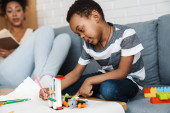 Skupiony afrykański chłopiec bawiący się z jej młodym ojcem w domu