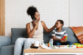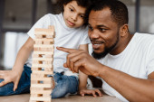 Zdjęcie "Szczęśliwy afrykański chłopiec bawi się z jej uśmiechniętym ojcem w domu" może być wykorzystywane do celów osobistych i komercyjnych zgodnie z warunkami zakupionej licencji Royalty-free. Obraz jest dostępny do pobrania w jakości wysokiej rozdzielczości do 5760x3840.