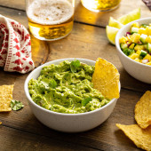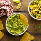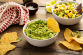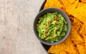 Chunky domowej roboty guacamole w misce z chipsami tortilla