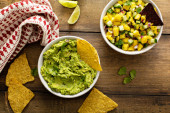 Zdjęcie "Chunky domowej roboty guacamole w misce z chipsami tortilla" może być wykorzystywane do celów osobistych i komercyjnych zgodnie z warunkami zakupionej licencji Royalty-free. Obraz jest dostępny do pobrania w jakości wysokiej rozdzielczości do 5760x3840.