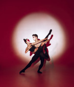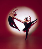 Tancerka baletowa tańcząca na czerwonym tle studia. Nowoczesny design. Współczesne kolorowe światło koncepcyjne jako wschodzące słońce w Japonii.