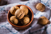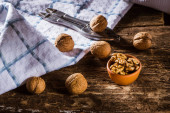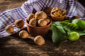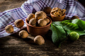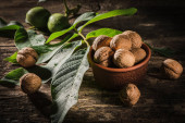 bowl with fresh walnuts, leaves and nut shell on gray stone background. Autumn seasonal.