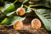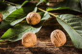 bowl with fresh walnuts, leaves and nut shell on gray stone background. Autumn seasonal.