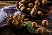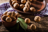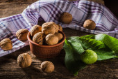 bowl with fresh walnuts, leaves and nut shell on gray stone background. Autumn seasonal.