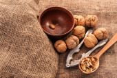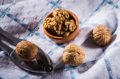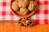 bowl with fresh walnuts, leaves and nut shell on gray stone background. Autumn seasonal.
