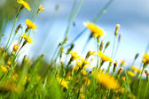 Baner 3: 1. Pole z żółtymi dmuchawcami przeciwko błękitnemu niebu i promieniom słońca. Wiosenne tło. Miękkie skupienie