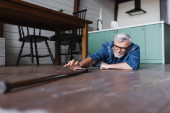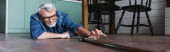 Samotny starszy mężczyzna trzymający pigułkę w pobliżu wody na stole