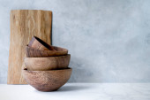 Drewniane tło kuchenne z naczyniami kuchennymi