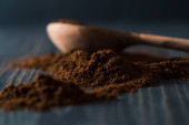 Tło tekstury kawy mielonej. Ziarna kawy są rozrzucone na stole..