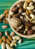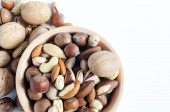 orzechy brazylijskie w drewnianej łyżce na tle rozrzucania różnych orzechów, różne orzechy