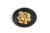 Smażone pierogi z ziemniakami i zieloną cebulą izolowane na białym tle.