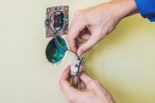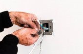 Elektryk ze śrubokrętem mocuje przewody elektryczne w zaciskach gniazdka instalacji elektrycznej. Przemysł budowlany.