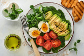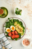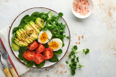 Zdjęcie "Świeża zielona sałatka z grillowanym filetem z kurczaka, szpinakiem, pomidorami, awokado, cytryną i czarnym sezamem z oliwą z oliwek w białej misce na jasnym tle łupkowym. Pojęcie diety żywieniowej. Widok z góry." może być wykorzystywane do celów osobistych i komercyjnych zgodnie z warunkami zakupionej licencji Royalty-free. Obraz jest dostępny do pobrania w jakości wysokiej rozdzielczości do 5760x3840.