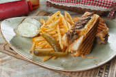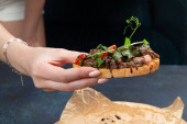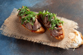 bruschetta z mięsem i rukolą. Zbliżenie. Skupienie selektywne