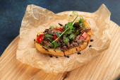 Zdjęcie "bruschetta z mięsem i rukolą. Zbliżenie. Skupienie selektywne" może być wykorzystywane do celów osobistych i komercyjnych zgodnie z warunkami zakupionej licencji Royalty-free. Obraz jest dostępny do pobrania w jakości wysokiej rozdzielczości do 5760x3840.