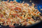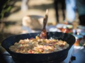 Czarne miski pico de gallo nad obrusem w kratkę