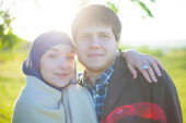 Młoda muzułmańska para kuca na trawie i spogląda w kamerę