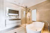 Zdjęcie "Wnętrze białej nowoczesnej łazienki w mieszkaniu" może być wykorzystywane do celów osobistych i komercyjnych zgodnie z warunkami zakupionej licencji Royalty-free. Obraz jest dostępny do pobrania w jakości wysokiej rozdzielczości do 5760x3840.