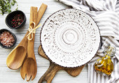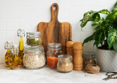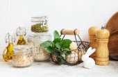 Zdjęcie "Przybory kuchenne, narzędzia i naczynia na tle białej ściany płytek. Wnętrze, nowoczesna kuchnia w jasnych kolorach. Puste miejsce na tekst, widok z przodu" może być wykorzystywane do celów osobistych i komercyjnych zgodnie z warunkami zakupionej licencji Royalty-free. Obraz jest dostępny do pobrania w jakości wysokiej rozdzielczości do 5760x3840.