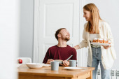 Szczęśliwa młoda para uśmiecha się i rozmawia podczas śniadania w domu