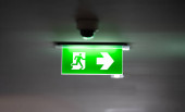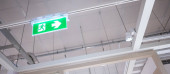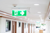 Znak Arrow light box EMERGENCY Fire EXIT wisi na suficie w szpitalnym chodniku, Pomysł na ćwiczenia przeciwpożarowe lub ewakuacyjne.