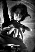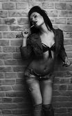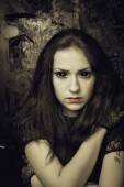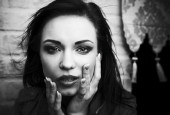 przygnębiona młoda brunetka z rozmazany szminka na jej twarzy.