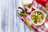 Zupa grzybowa z fasolą nerkową, ziemniakiem i marchewką. Widok z góry, przestrzeń kopiowania