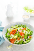 Wegetariańskie świeże warzywa sałatka organiczna z ogórkiem, czerwony papryka, czerwona cebula, kukurydza i sałata zielona