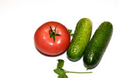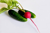 Zdjęcie "Na stole są dwa ogórki i czerwona rzodkiewka.." może być wykorzystywane do celów osobistych i komercyjnych zgodnie z warunkami zakupionej licencji Royalty-free. Obraz jest dostępny do pobrania w jakości wysokiej rozdzielczości do 5760x3840.