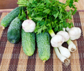 Martwa natura ze świeżych warzyw: ogórka, rzodkiewki i cebuli.