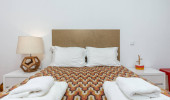 Przestronna sypialnia z dużym i przytulnym łóżkiem i wieloma kolorowymi dekoracjami