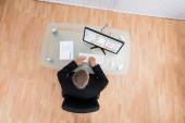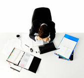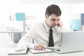 biznesmen zmęczony śpi podczas obliczania kosztów w biurze