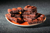 Zbliżenie połowy brazylijskiego ciasta miodowego z brygadierem (brigadeiro).
