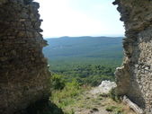 Ruiny starej twierdzy w Vrdniku, Sremska Mitrovica, Vojvodina, Serbia. Starożytne kamienne ściany z pasmami górskimi w tle. Zabytki turystyczne. Krawędź ściany.