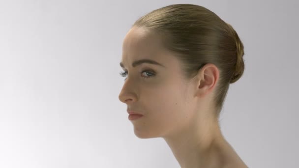 Portret kobiety tancerki patrzącej na kamerę w studio. Piękna kobieta dotykająca szyi.