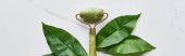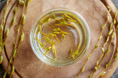 Zielony proszek chlorelli glonów na metalowej łyżeczce nad misą, widok z góry. Zdrowa superżywność.