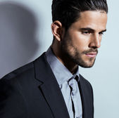 Muslim businessman holding hand near chin isolated on grey