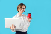 Kobieta programistka z laptopem na tle koloru