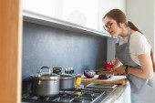 młody piękny gospodyni gospodarstwa domowego trzymając nóż na kuchnia