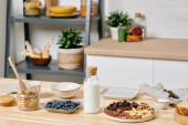 Wnętrze dużej kuchni z dużą ilością zdrowej żywności i butelki mleka na drewnianym stole